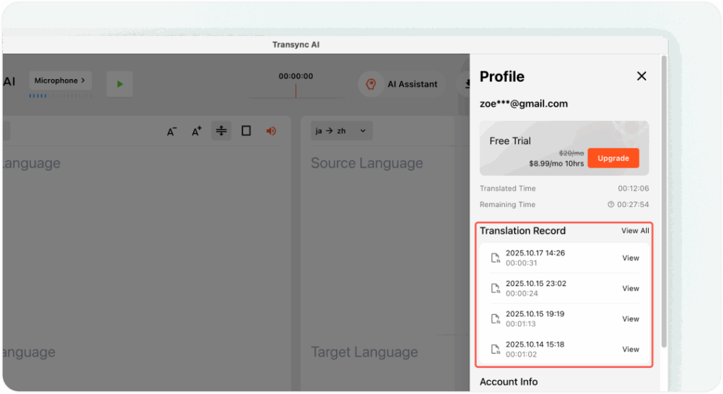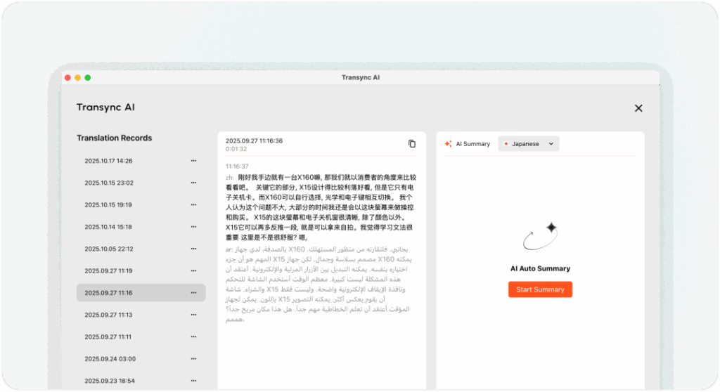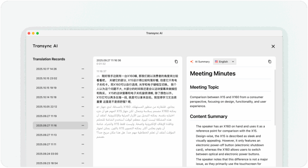 After each translation session in Transync AI, you can easily review the full transcript and generate a AI meeting summary. Follow these steps to manage your meeting data efficiently and securely. or you can check our homepage.