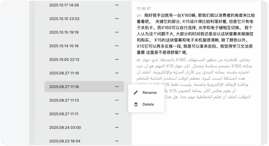 - Click View to open any session and review its original text and translations. For easier management, you can rename each translation record to make future searches more convenient.