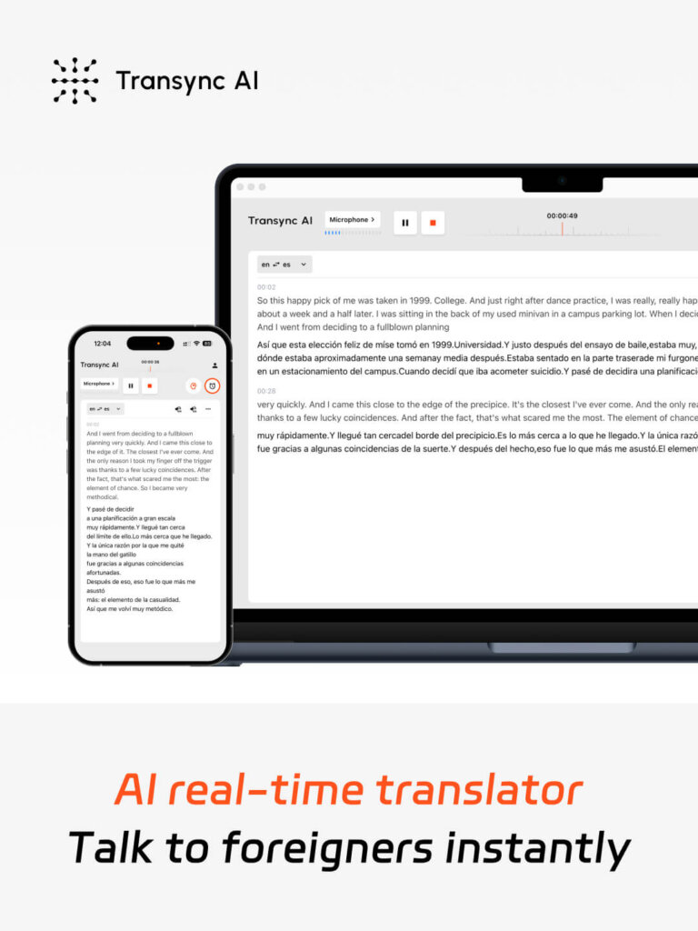 जब आपको आवश्यकता हो स्पैनिश और अनुवाद बैठकों, कार्यक्रमों या दैनिक संचार के लिए, ट्रांससिंक एआई निम्नलिखित सुविधाएँ प्रदान करता है: