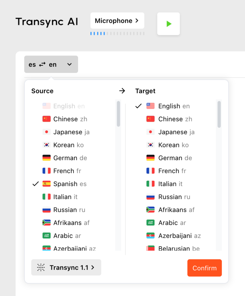 ट्रांससिंक एआई एक ही सत्र में अंग्रेजी से स्पेनिश और स्पेनिश से अंग्रेजी दोनों भाषाओं के लिए सहायता प्रदान करता है। वक्ता और प्रतिभागी शामिल होते समय अपनी पसंदीदा भाषा का चयन करते हैं, जिससे अंग्रेजी और स्पेनिश के मिश्रित वार्तालाप सहजता से संचालित होते हैं।.