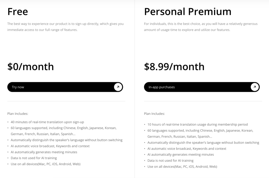 | Nível básico/gratuito | Características de teste individuais | $0 / mês | Oferece 40 minutos de tradução em tempo real após a inscrição; os dados não são usados para treinamento de IA. |