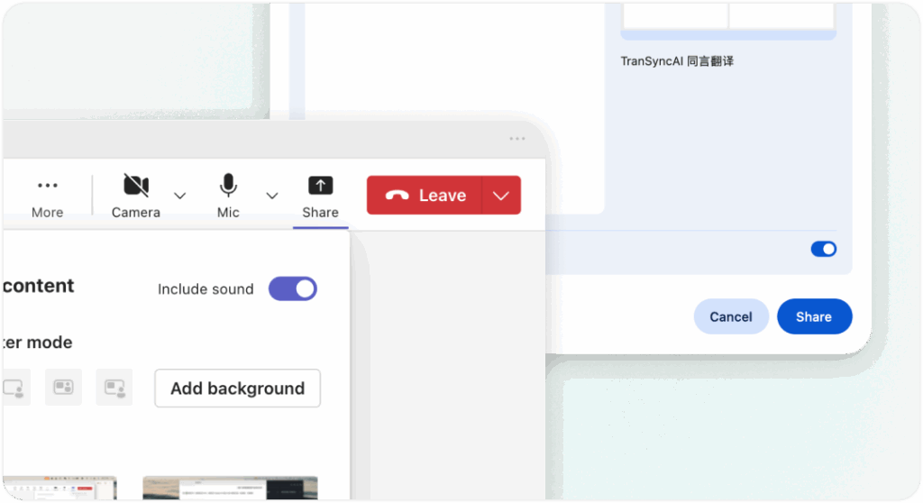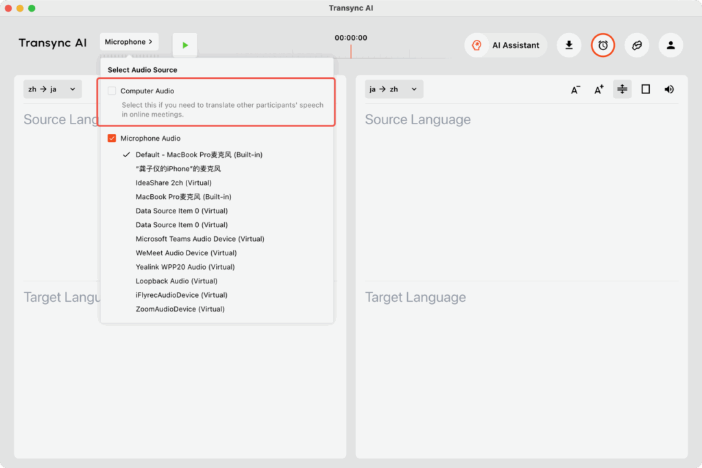 In Transync AI, check the “Computer Audio” option to ensure the voices of other participants are captured and translated in real time.